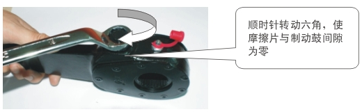 安裝前確保制動(dòng)氣室推桿處于初始位置,左右氣室初始長(zhǎng)度一致,允許誤差±1.5mm。將調(diào)整臂安裝好后,按下圖進(jìn)行制動(dòng)間隙調(diào)節(jié)。