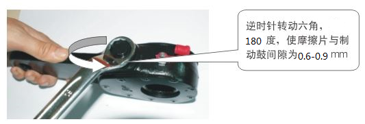 ④調(diào)節(jié)控制臂,用12扳手按順時(shí)針方向旋轉(zhuǎn)六角頭,使摩擦片與制動(dòng)鼓間隙為零。再逆時(shí)針轉(zhuǎn)動(dòng)六角頭3/4圈。完后實(shí)施15次以上制動(dòng),自動(dòng)將間隙調(diào)整臂預(yù)設(shè)間隙。